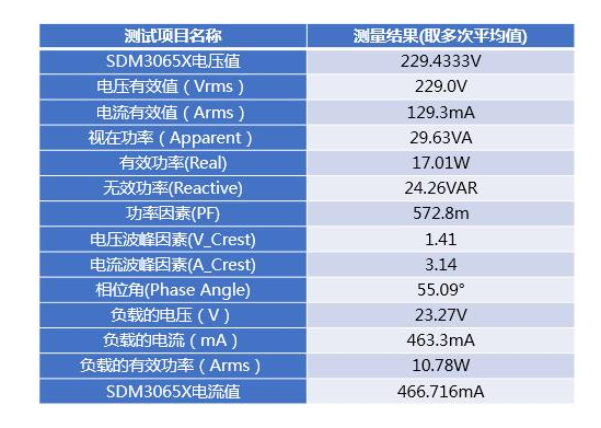 為驗證負(fù)載的實際功率。我們把SDM3065X作為電流表接入到負(fù)載電路中,如圖6所示;同時把高壓差分探頭和電流探頭接入到負(fù)載電路中。在功率分析中,選擇電壓均方根、電流均方根、有效功率。結(jié)果如圖7所示: