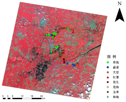 本次的案例我們采用“珠海一號(hào)”高光譜衛(wèi)星OHS-2(貴陽(yáng)一號(hào))的影像——河北雄安新區(qū),作為實(shí)驗(yàn)區(qū)域。高光譜遙感影像數(shù)據(jù)經(jīng)過輻射定標(biāo),并在定標(biāo)結(jié)果的基礎(chǔ)上進(jìn)行了FLAASH大氣校正。為了實(shí)驗(yàn)的準(zhǔn)確性,我們還對(duì)研究區(qū)域進(jìn)行實(shí)地調(diào)查,調(diào)查樣點(diǎn)如圖1所示。