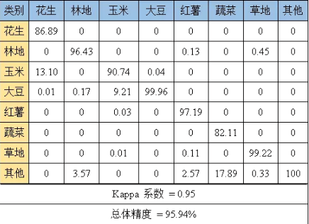 實(shí)驗(yàn)利用“珠海一號(hào)”高光譜遙感衛(wèi)星影像數(shù)據(jù),結(jié)合實(shí)地調(diào)查樣點(diǎn),基于決策樹分類方法,對(duì)研究區(qū)土地覆蓋類型進(jìn)行分類,利用驗(yàn)證樣點(diǎn)基于混淆矩陣并利用實(shí)測(cè)點(diǎn)對(duì)分類結(jié)果進(jìn)行精度驗(yàn)證Kappa系數(shù)為0.95,總體精度達(dá)95.94%,精度評(píng)價(jià)結(jié)果如下表1所示,其中花生、玉米、大豆、紅薯、蔬菜具有較高的分類精度,花生和玉米存在小部分混分,由于遙感影像不可避免會(huì)存在“同譜異物”現(xiàn)象,導(dǎo)致蔬菜和其他植被存在混分現(xiàn)象。