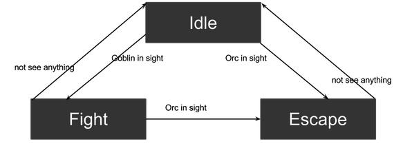 首先要說(shuō)一下有限狀態(tài)機(jī)(FSM),一般應(yīng)用于游戲機(jī)器人,網(wǎng)絡(luò)協(xié)議,正則表達(dá)式,詞法語(yǔ)法分析,自動(dòng)客服等。如下圖是一個(gè)簡(jiǎn)單的游戲機(jī)器人狀態(tài)轉(zhuǎn)移和行動(dòng)圖。