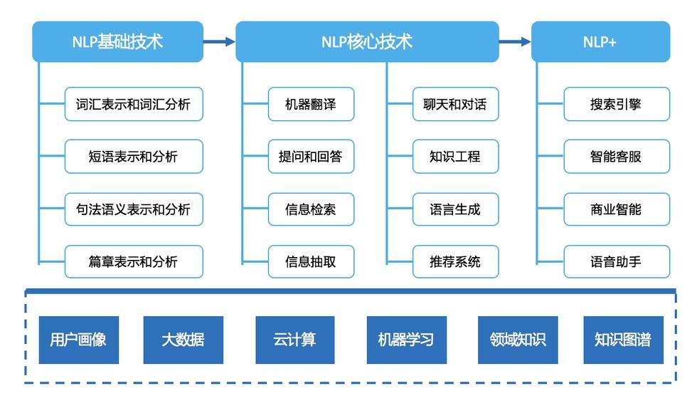 NLP是人工智能的另一個(gè)目標(biāo),用于分析、理解和生成自然語(yǔ)言,以方便人和計(jì)算機(jī)設(shè)備進(jìn)行交流,以及人與人之間的交流。它的應(yīng)用領(lǐng)域包括:機(jī)器翻譯,文本、語(yǔ)音、圖片轉(zhuǎn)換,聊天機(jī)器人,自動(dòng)摘要,情感分析,文本分類(lèi),信息提取等。以下給出了自然語(yǔ)言處理簡(jiǎn)要的知識(shí)架構(gòu)圖。